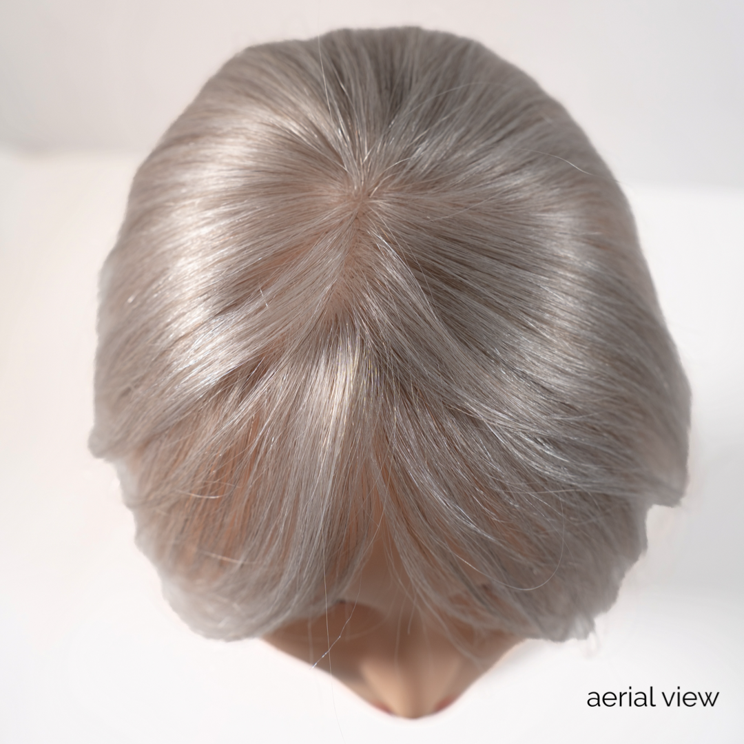 The Fringe Topper is a light/medium density topper that provides full coverage around your front hairline and bang area. It is hand tied 1 hair at a time for a natural seamless look and provides natural coverage in the front for a natural bang look. The Mono Lined Swiss Lace construction provides a scalp illusion effect and a thin transition in front of the hairline for a natural bang look. The Fringe Topper is multi directional allowing the parting to be versatile and changeable.