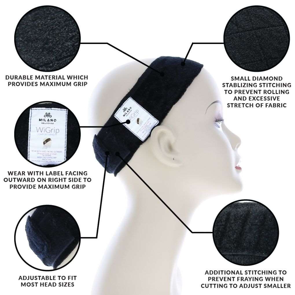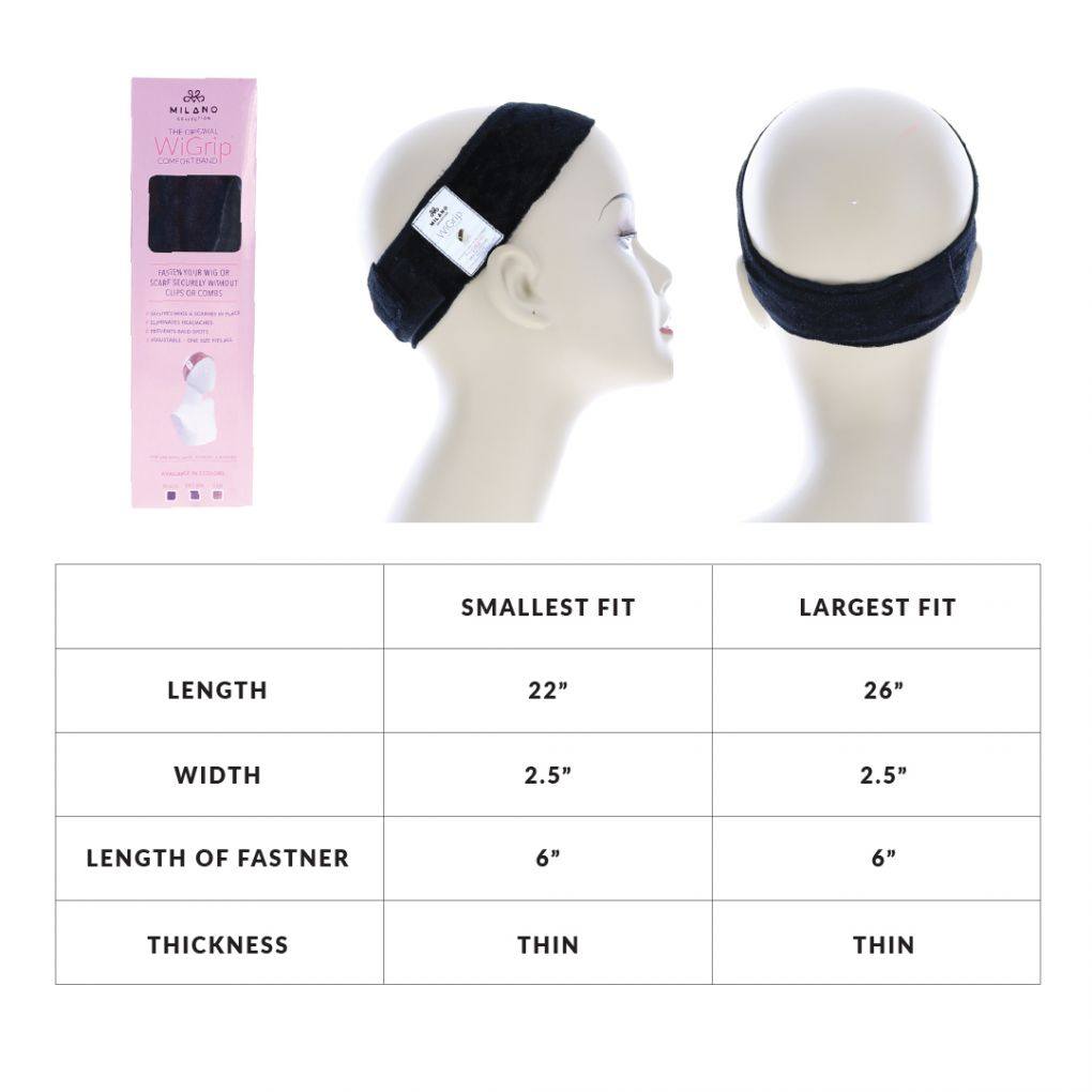 MILANO COLLECTION WiGrip No-Slip Wig Grip Comfort Band is a comfortable secure alternative to clips, combs, glues or tapes. It keeps your wig from slipping or moving, letting you be confident and care-free all day long. It can be used with any silk top or wefted top wigs and units. It prevents wig-associated headaches, tension and balding by placing a thin, soft barrier between your head and the wig's interior cap.